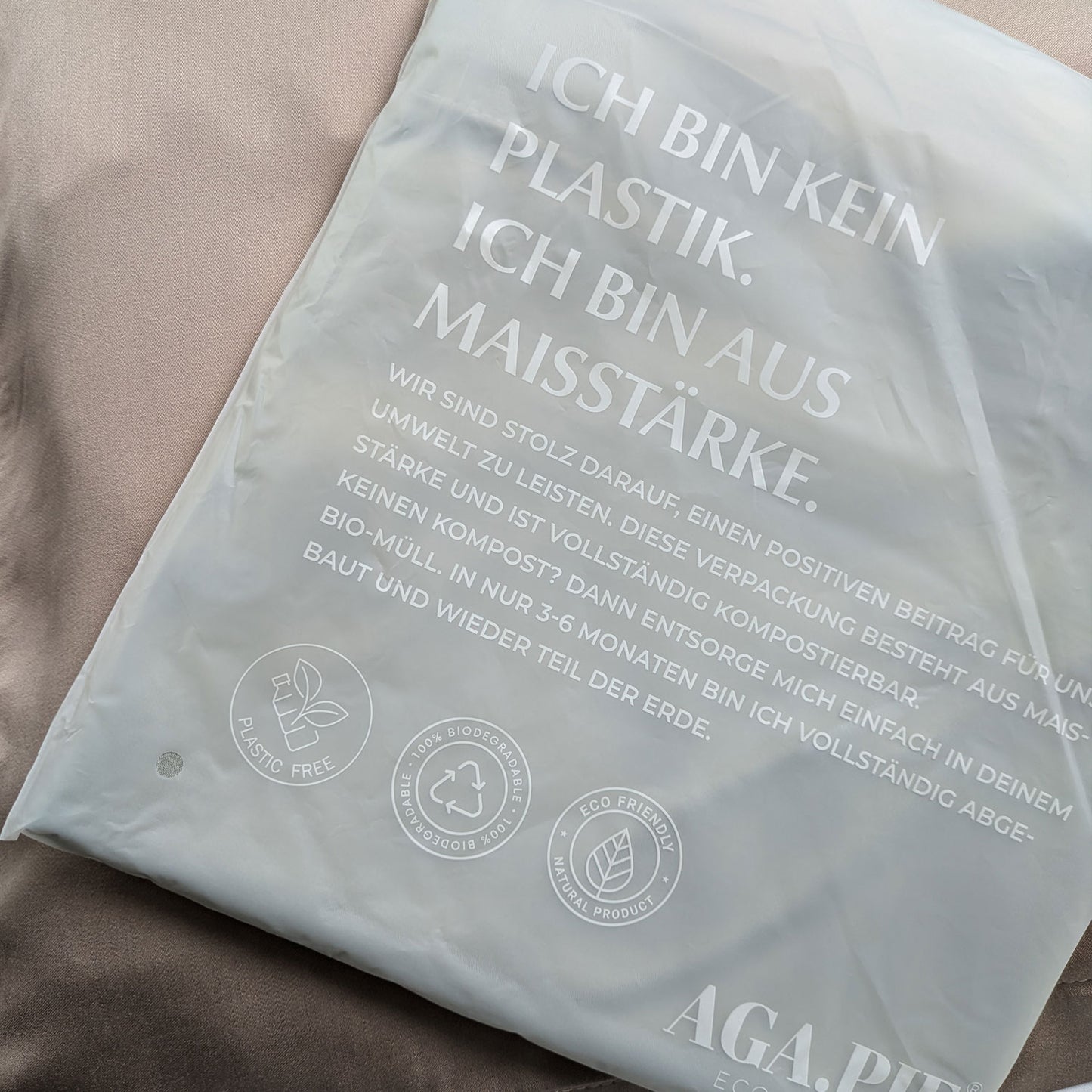Die einzelnen Kopfkissenbezüge werden in Polybags aus Maisstärke verpackt. Es sind also keine echten Polybags (kein Plastik), sondern sie können auf dem Kompost oder im Bio-Müll entsorgt werden. In nur 3-6 Monaten sind sie vollständig abgebaut und wieder Teil der Erde.